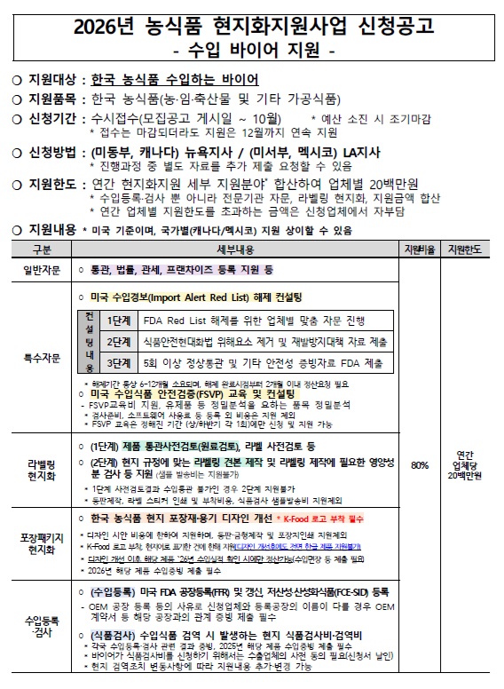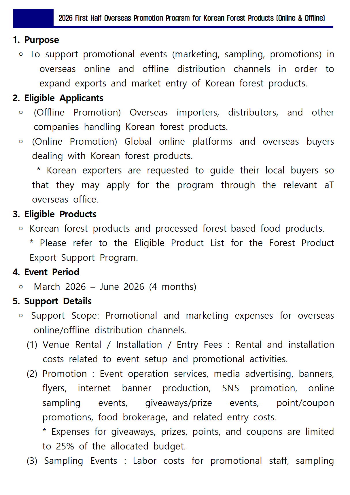 2026년 해외판촉사업 정기판촉 바이어 모집 공고 1. 사업목적 ◦ 해외 판촉(시식, 시음 등) 지원을 통한 한국 농식품 수출·입점 확대 및 소비자 인지도...