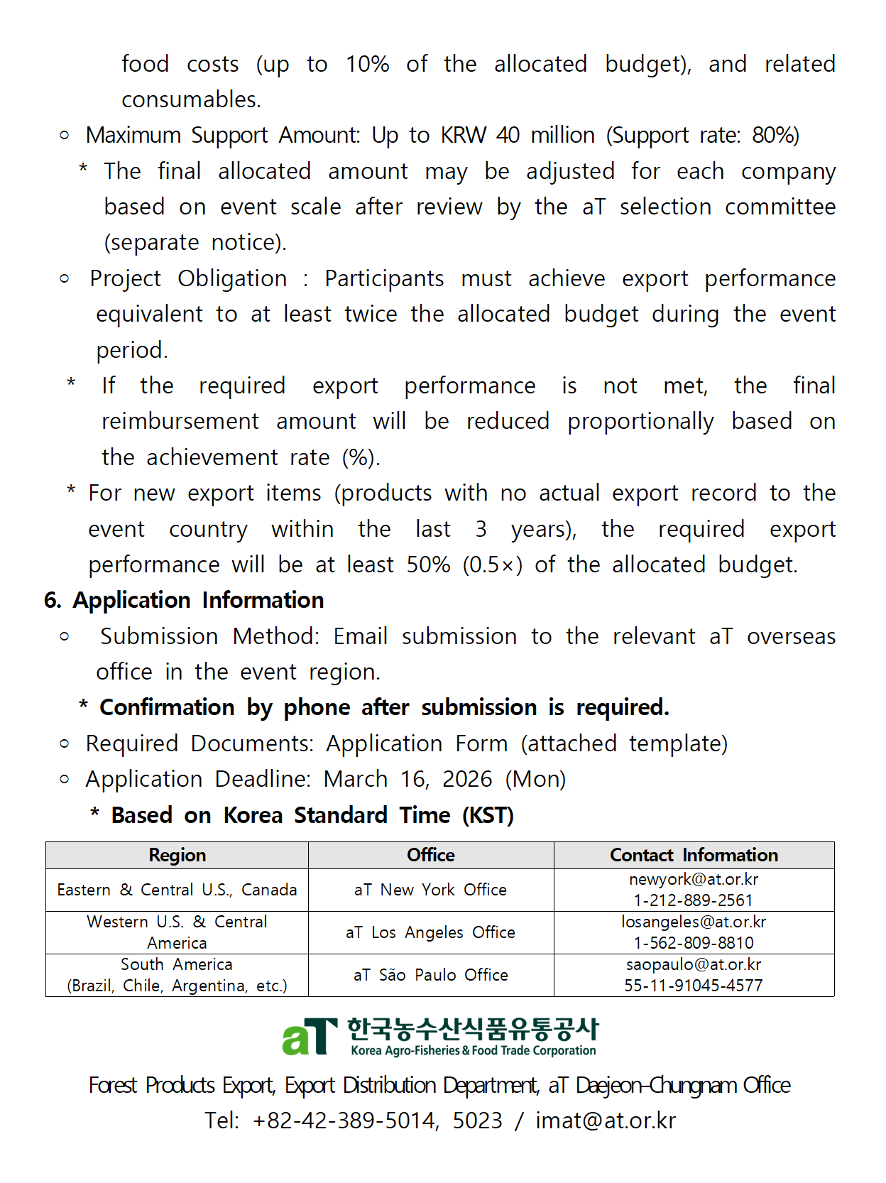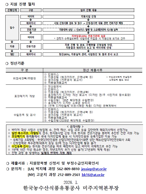 ㅇ 지원내역 : aT 뉴욕지사 지정 물류창고(냉장/냉동) 사용에 대한 입/출고비 및 보관료의 80% ㅇ 지원자격 : 한국산 농식품 취급 바이어 및...