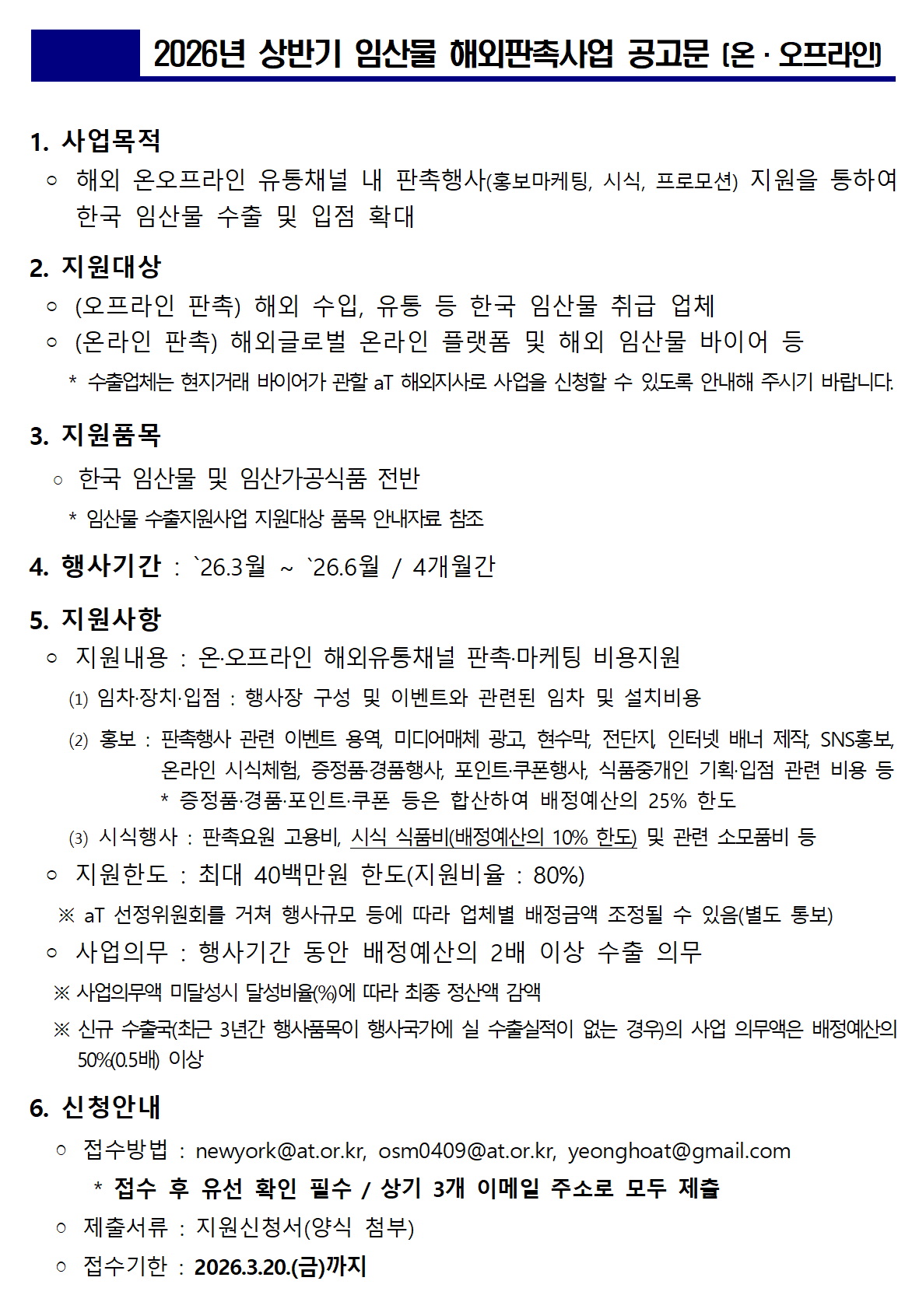 ㅇ 지원내역 : aT 뉴욕지사 지정 물류창고(냉장/냉동/상온) 사용에 대한 입/출고비 및 보관료의 80 ㅇ 지원자격 : 한국산 농식품 취급 바이어 및...